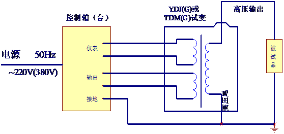 把電源輸入有過流自動(dòng)脫扣及防止突發(fā)加壓的零位連鎖裝置的操作箱,經(jīng)自耦調(diào)壓器調(diào)節(jié)電壓輸入YDQ-J試驗(yàn)變壓器初級(jí)繞組,根據(jù)電磁感應(yīng)原理,在次級(jí)(高壓)繞組按其與初級(jí)繞組匝數(shù)之比可獲得同等倍數(shù)的電壓幅值-工頻高壓。