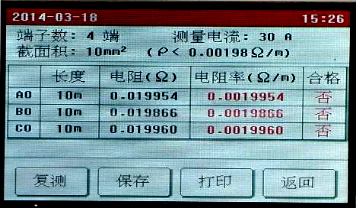 點擊需要修改的參數(shù)設(shè)置框設(shè)置參數(shù),全部設(shè)置完成后點擊“開始”按鈕,儀器即按照設(shè)置的參數(shù)開始自動測量各端子的電阻值,并計算電阻率,自動判斷接地線是否合格。