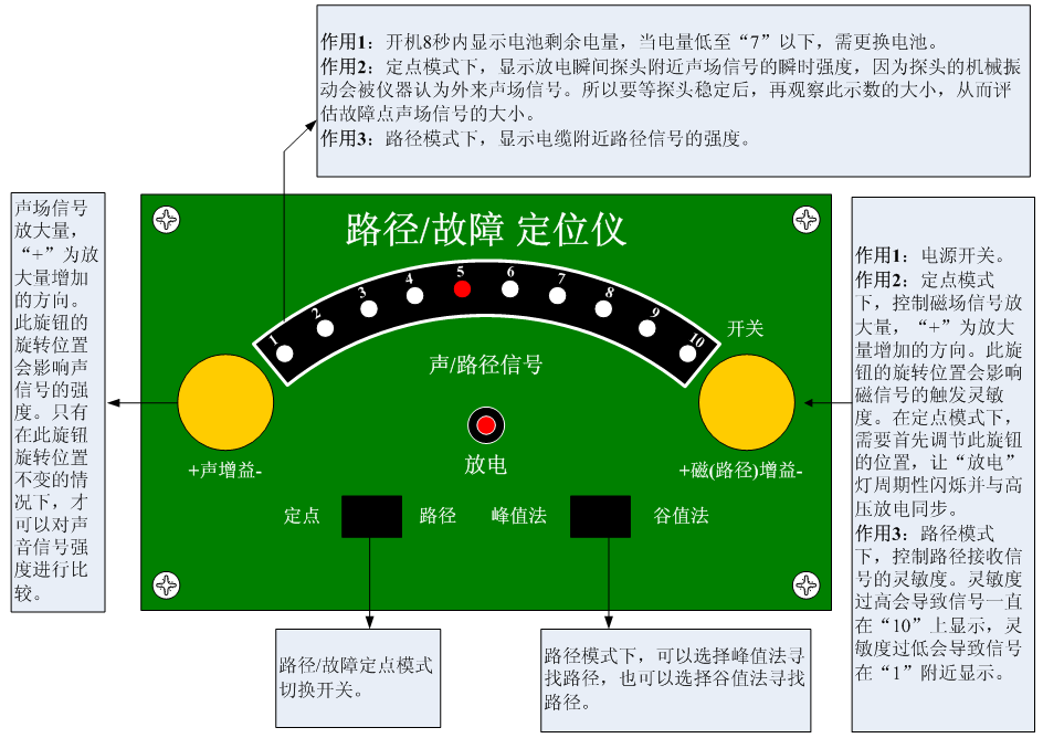 步驟2 將“定點/路徑”模式開關(guān)切換到“路徑”模式然后打開路徑/故障定位儀的電源開關(guān),開機8秒內(nèi)顯示電池電量(電量低于“7”時需更換電池!)。
