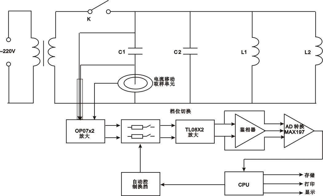 在被測(cè)電容支路有對(duì)被測(cè)電容的電壓、電流取樣的取樣電路,取樣電路的輸出端分別接放大電路,從電壓放大電路輸出的電壓信號(hào)和從電流放大電路輸出的電流信號(hào)通過(guò)鑒相器輸出相位差信號(hào),與電壓信號(hào)和電流信號(hào)通過(guò)A/D轉(zhuǎn)換器后,輸入CPU計(jì)算而得到被測(cè)電容值。因?yàn)椴捎昧艘苿?dòng)的電流取樣單元,而使得無(wú)需拆除連接線就可以直接測(cè)量電容值。